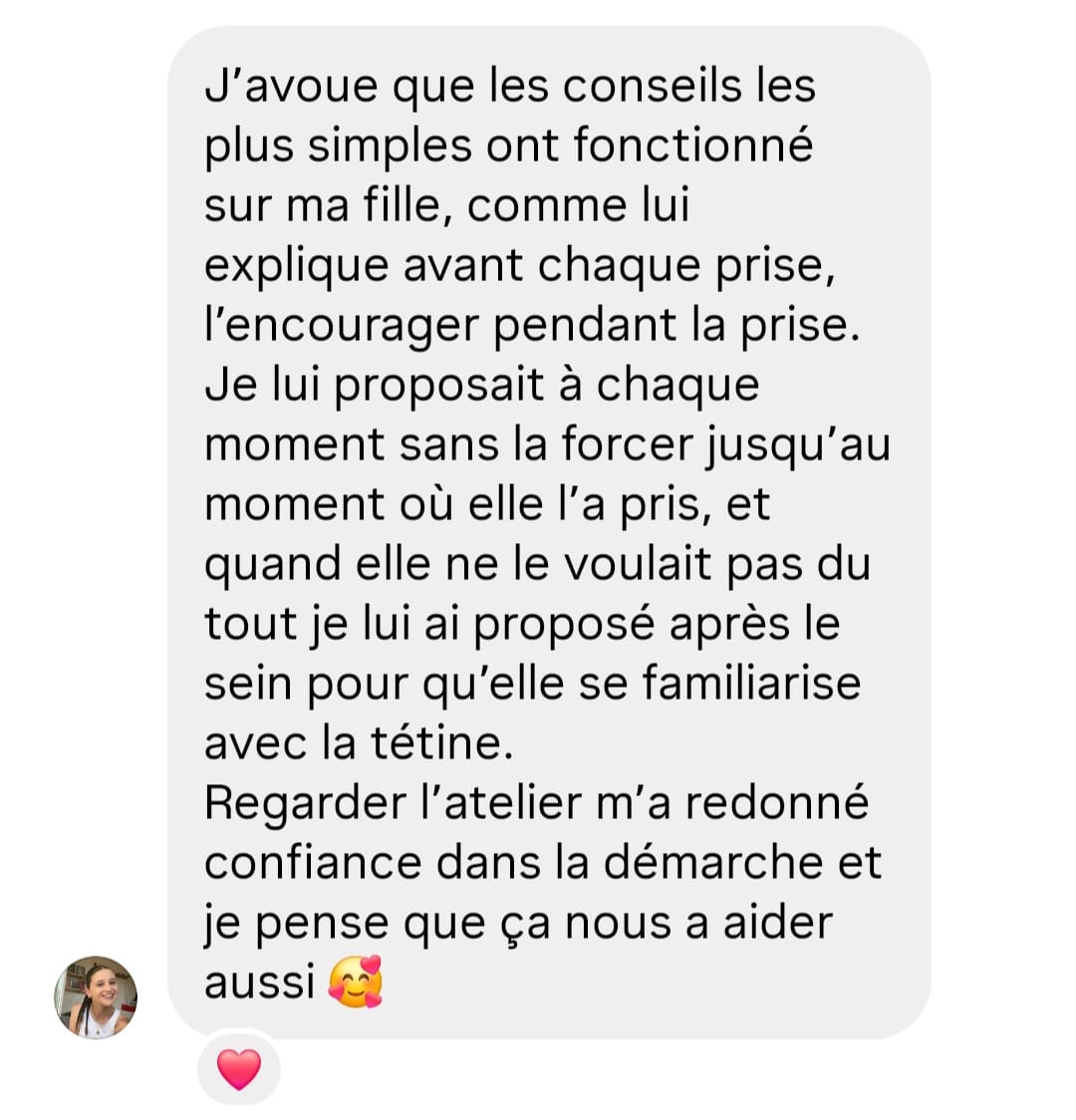 2h d'atelier en replay pour comprendre ce que personne ne vous explique sur le refus du biberon en 2025, découvrir pourquoi tout les biberons achetés et essayés n'ont pas eu de succès, connaître quels biberons utiliser, repartir avec ma méthode testée et approuvée à mon cabinet